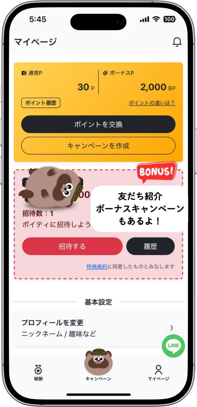 フォローやいいねなどのアクションをすると即ポイントが反映。隙間時間に手軽に取り組めます。